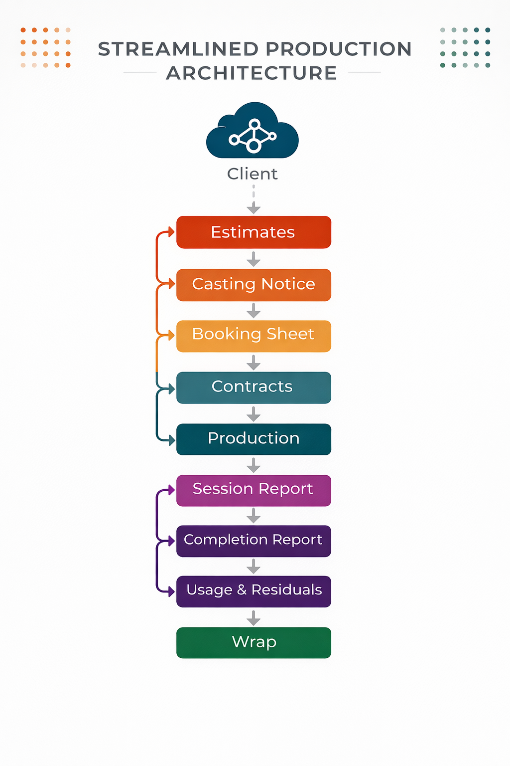 The platform unifies the full production workflow — from onboarding through residuals and project wrap — supported by shared infrastructure responsible for payroll, compliance, approvals, payment processing, reporting, and monitoring.